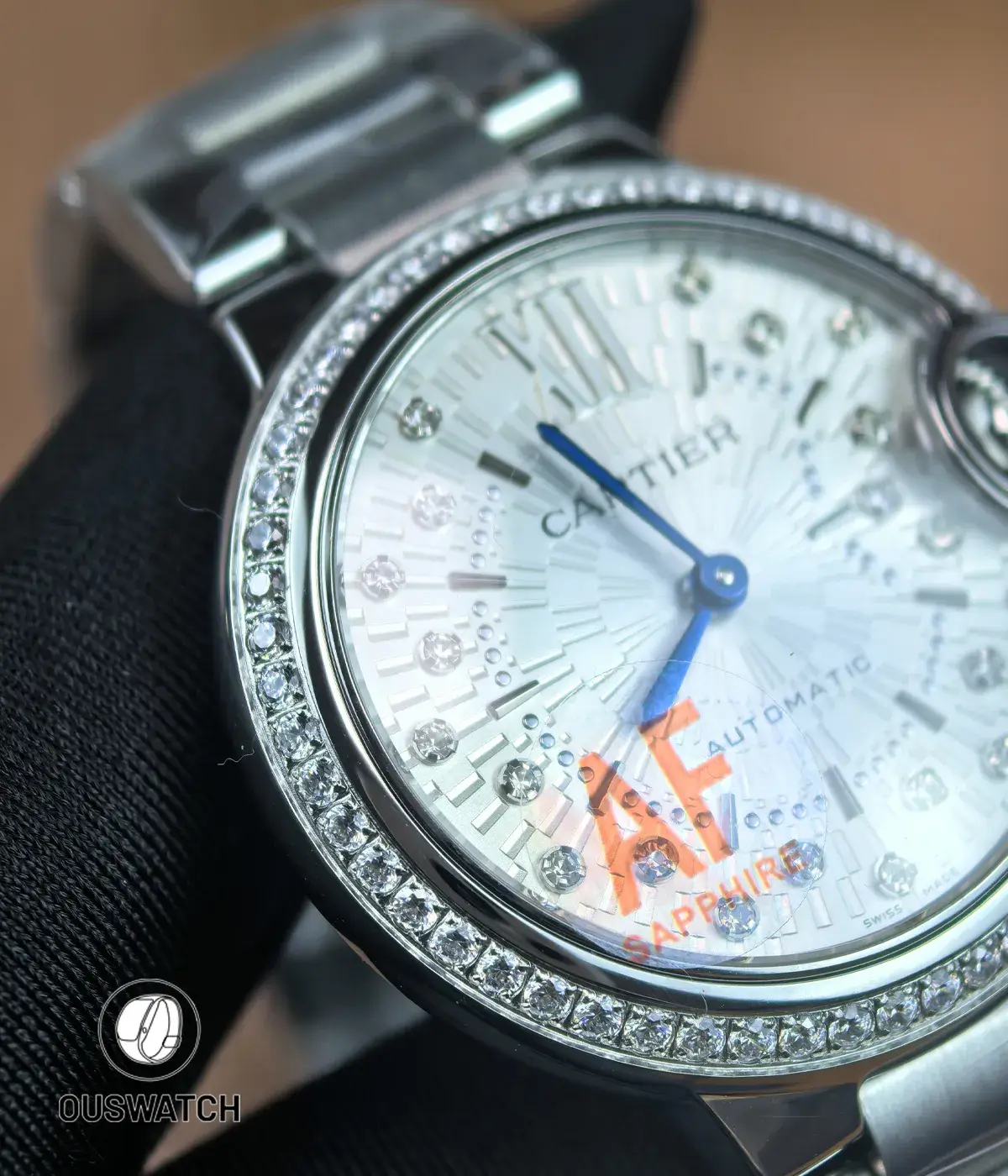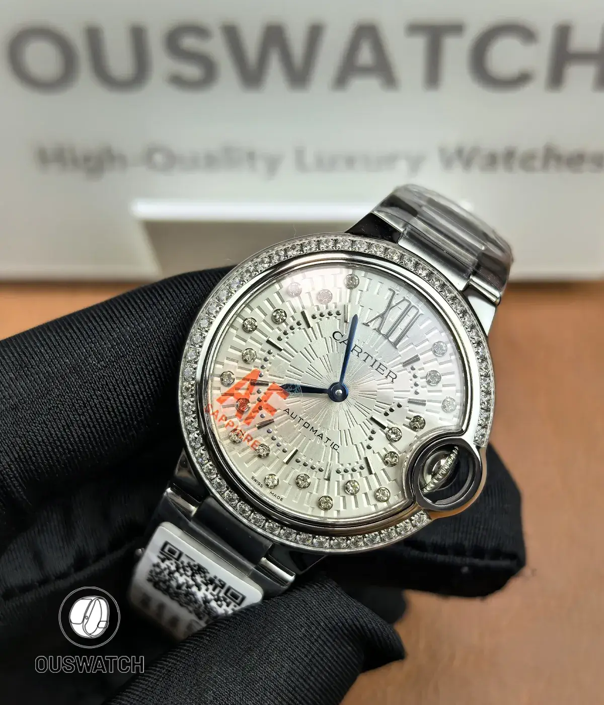 The Cartier Iced Out Ballon Bleu W4BB0035 is a high-end women’s clone of Cartier’s 33 mm Ballon Bleu with a diamond-set bezel and silver dial. Crafted by top-tier AF factory, it features a 33 mm 316L stainless steel case and matching bracelet. The bezel is paved with 50 brilliant-cut diamonds, and the silver sunray dial is set with 21 diamond indices, creating an “iced-out” look. The fluted crown is topped with Cartier’s signature synthetic blue spinel. Power comes from a Swiss automatic clone movement (Cartier Cal. 076) that winds itself with your wrist motion. This Ballon Bleu replica combines luxurious sparkle (real-steel plus crystal “diamonds”) with the polished craftsmanship and reliability Cartier is known for. As your trusted source for the best super clone watches, we ensure each piece mirrors the authentic Ballon Bleu’s design in every detail.