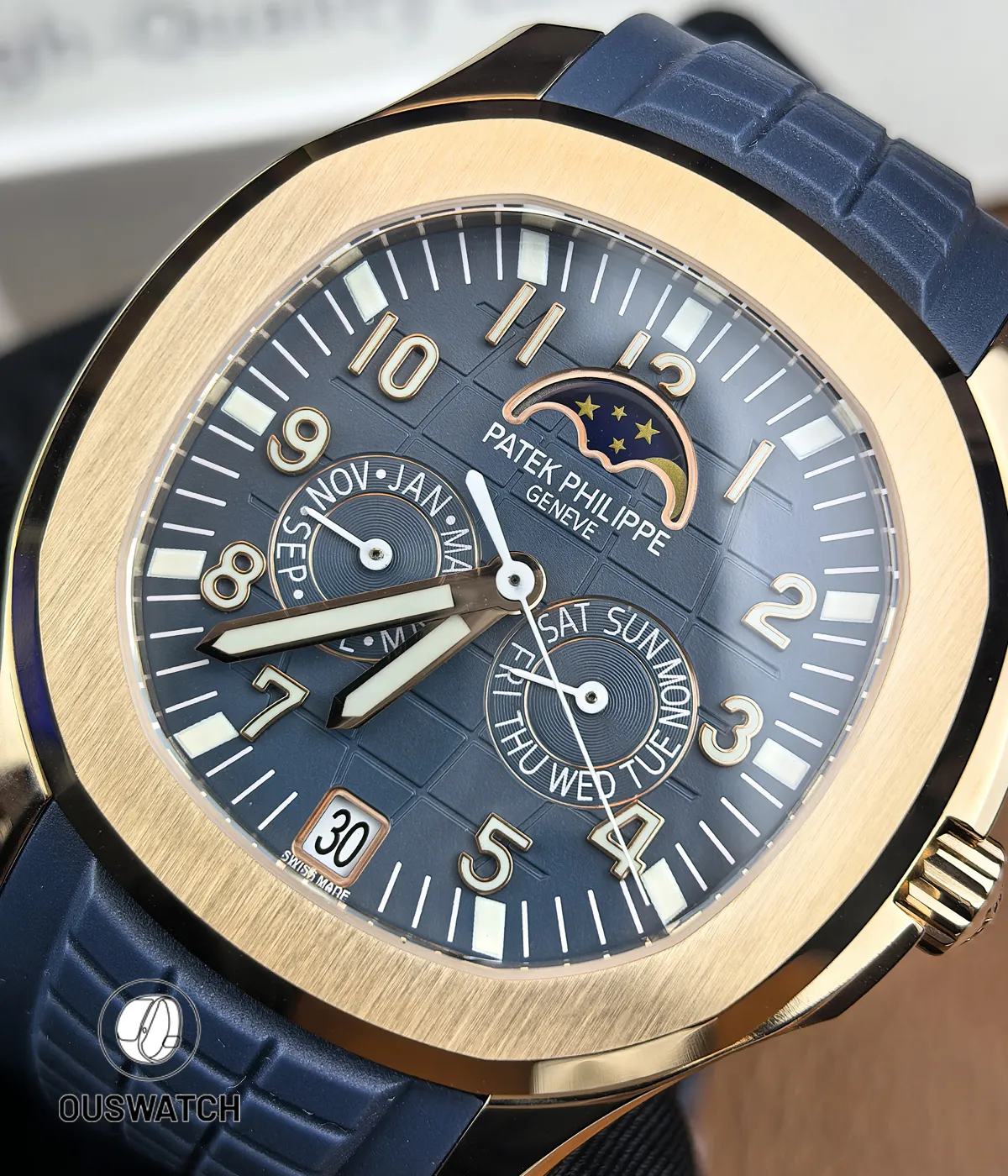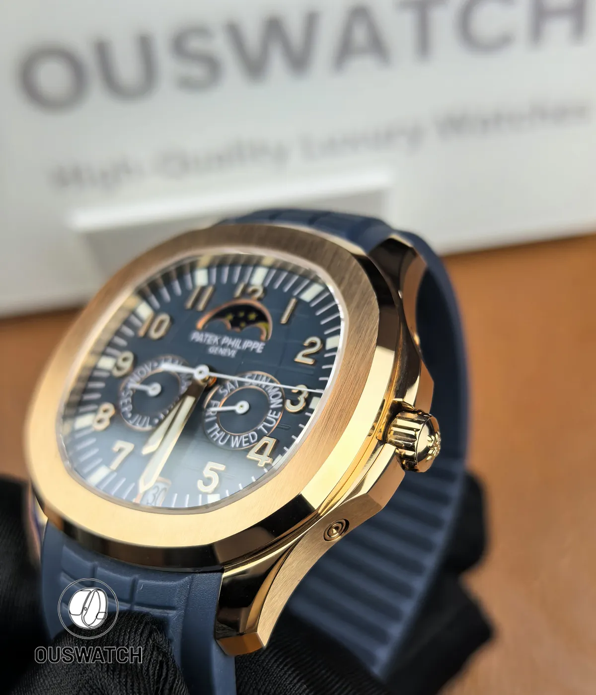 Crafted in rose gold–finished stainless steel and paired with a deep blue dial, the watch is powered by a Swiss clone automatic movement that fully realizes the original complication layout. The annual calendar accurately displays day, date, and month, while the moonphase operates as a true mechanical function rather than a decorative element. It is an ideal choice for enthusiasts seeking a sophisticated Patek Philippe Aquanaut rose gold watch with real complications—at a practical and transparent value.
