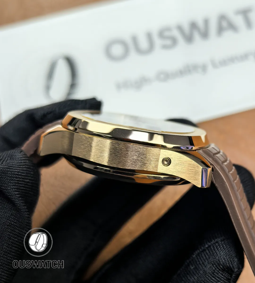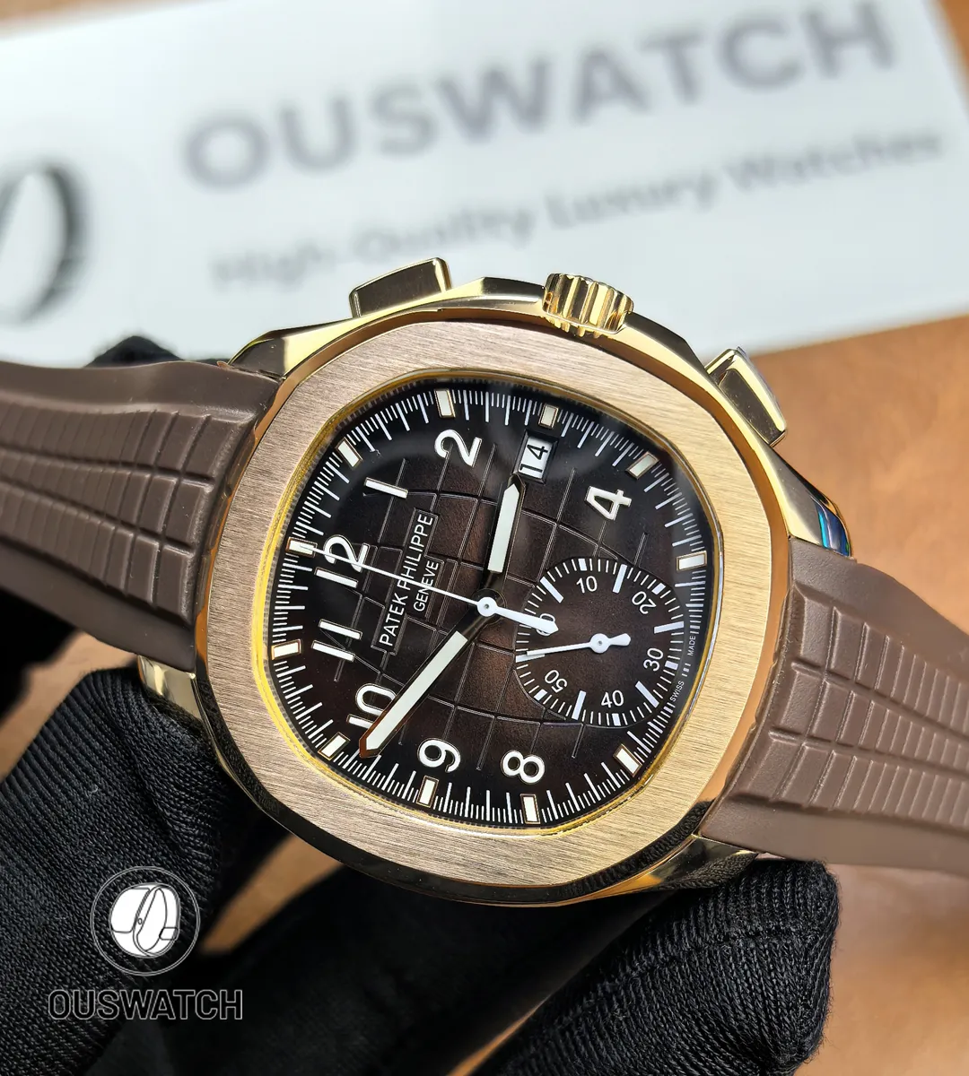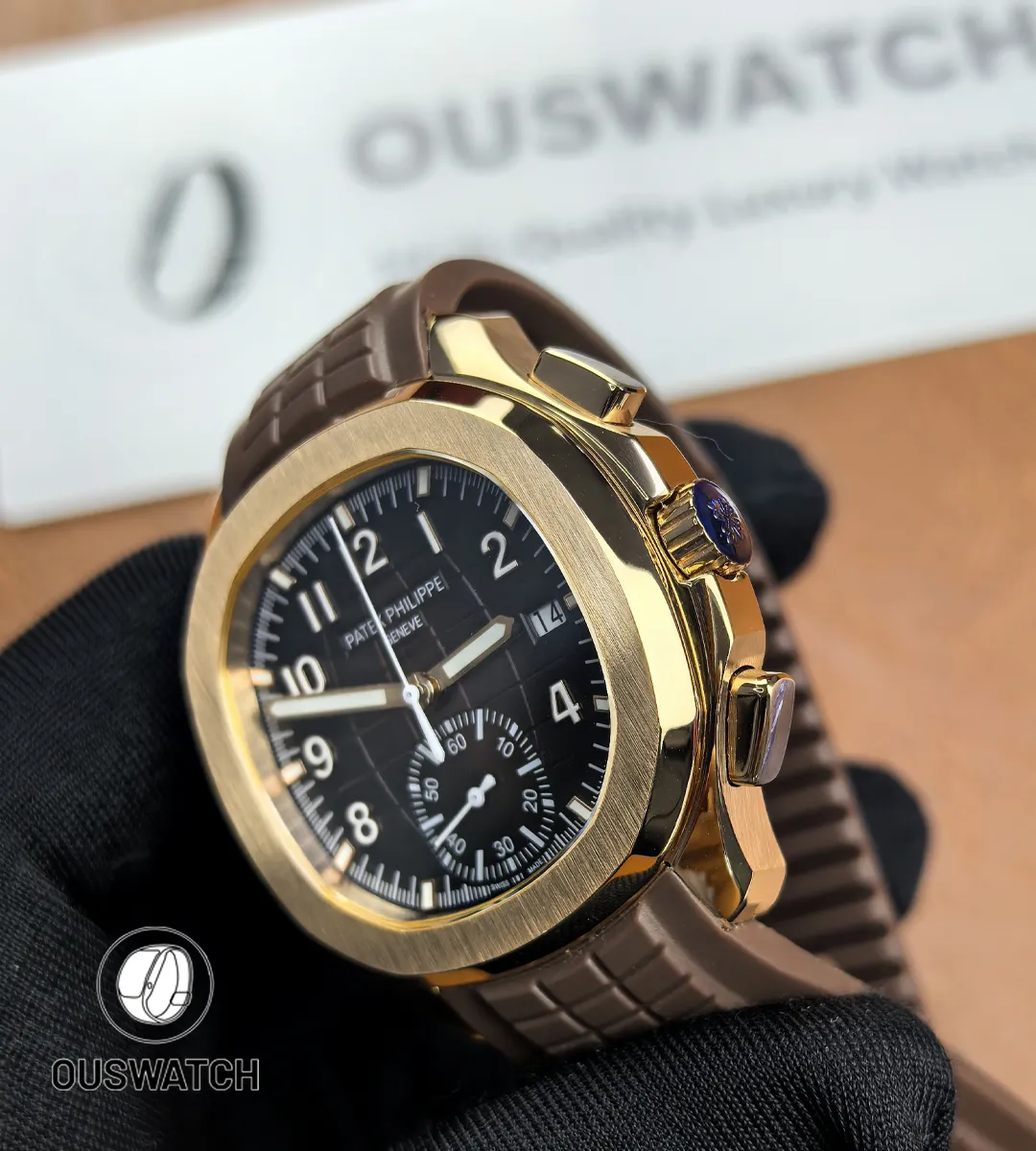 This Aquanaut replica is impressive. The rose gold tone is spot on and the brown dial has great depth. The chronograph subdials are perfectly aligned. Highly recommend for a luxury sports watch.