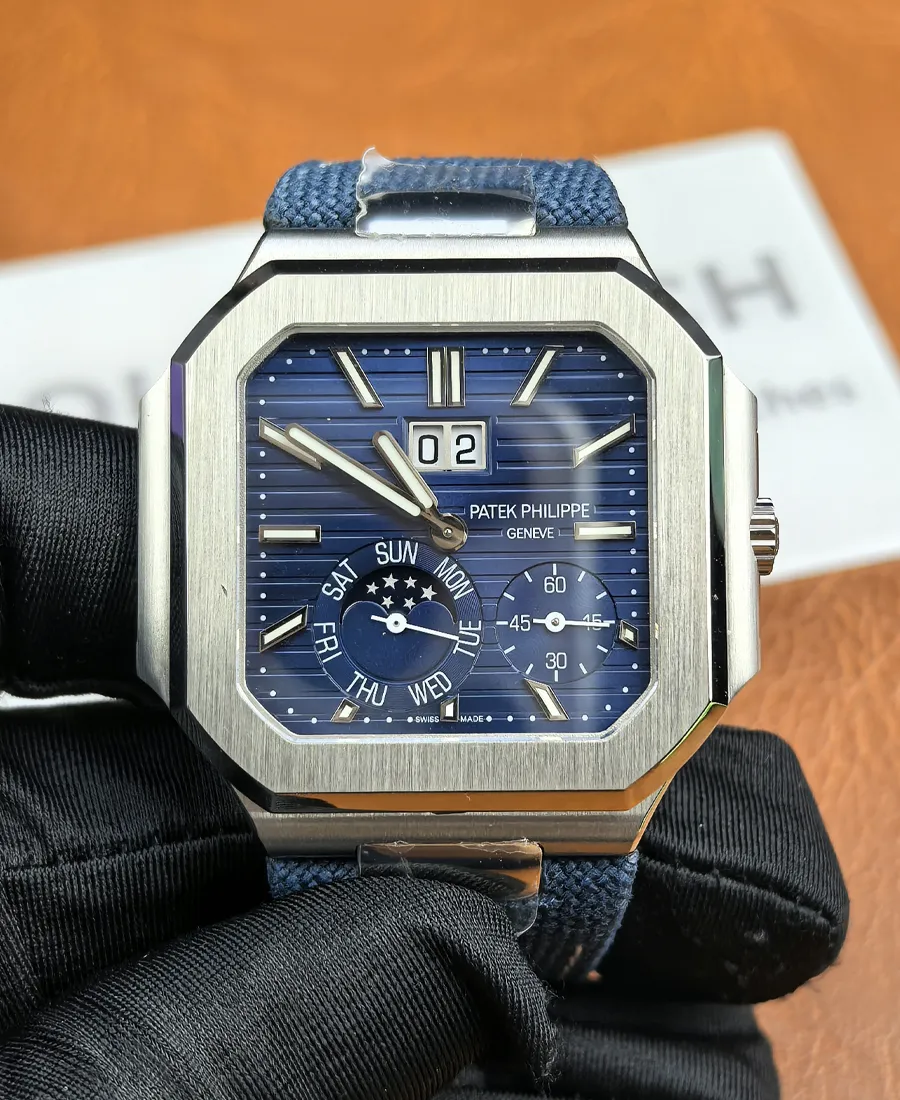 Grand Complications & Cubitus: We also offer clones of Patek’s most complex pieces. Notably, the new Cubitus 5822P (square platinum case) is a technically advanced clone. It features an instantaneous large double-date, day, and moonphase (6 patent applications on the original). Our 5822P clone mimics the platinum case with its diamond at 6 o’clock and contrasting polished/satin surfaces. The sunburst blue dial with horizontal embossing and mini-rotor self-winding movement (with grand date and moonphase) are all closely copied. Other Grand Complication clones (e.g. perpetual calendars or minute repeaters) are built on similarly high-grade clone movements with all complications functional.