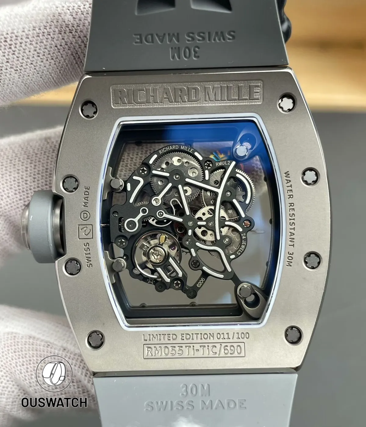 The richard mille rm 055 Grey Titanium case is engineered to balance durability, weight, and visual complexity, closely following the structural principles of the original RM architecture.