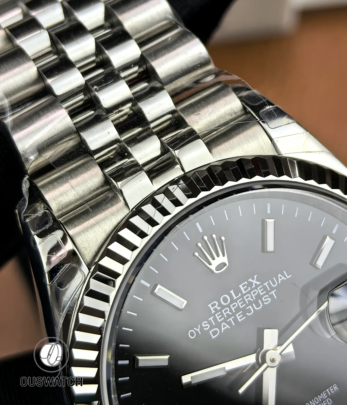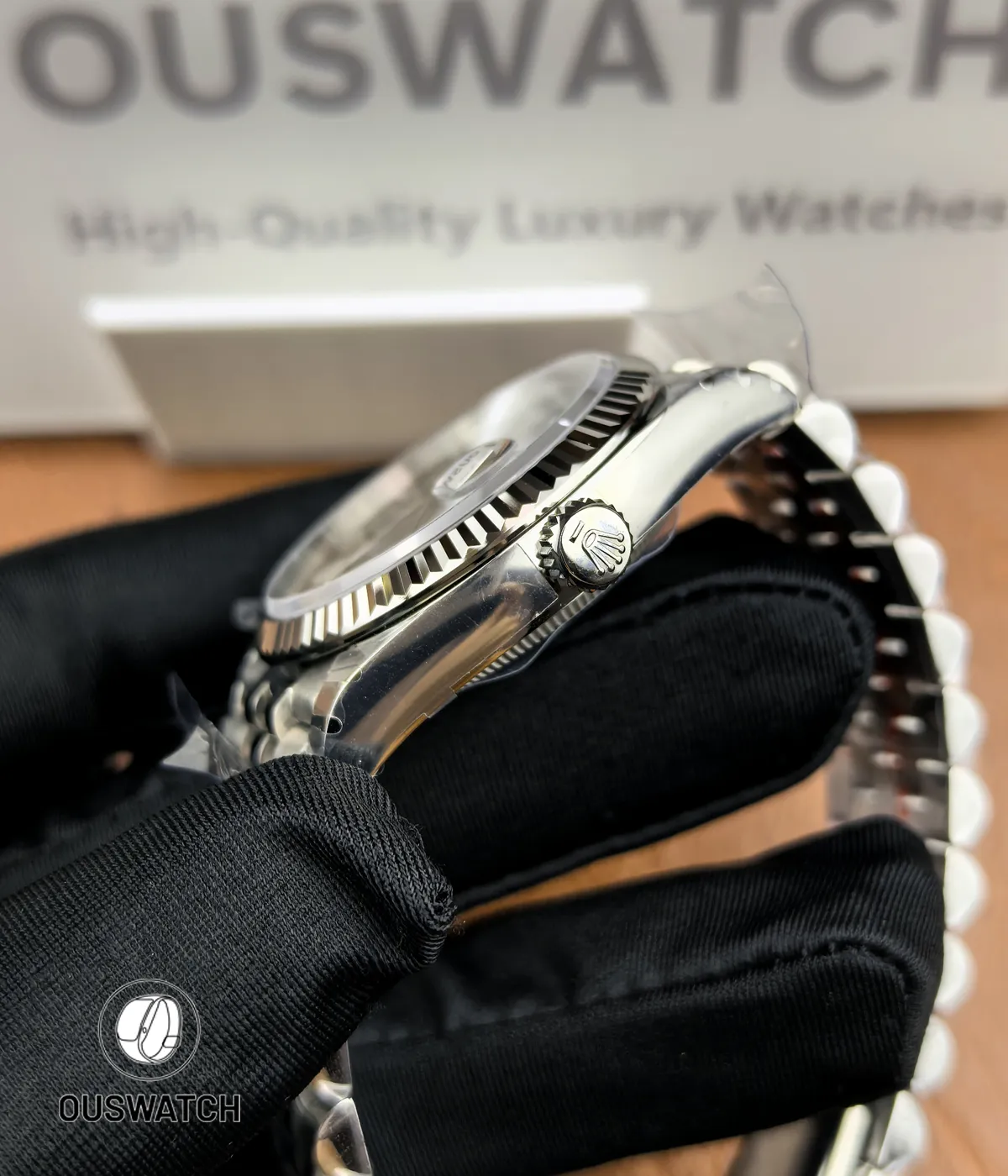 | Case | 36mm in diameter, crafted from solid 904L stainless steel (Oystersteel). The case features the classic Datejust profile with a polished finish on the lugs and case sides, providing the perfect canvas for the bezel and bracelet. The dimensions are a faithful 1:1 reproduction of the genuine model. |