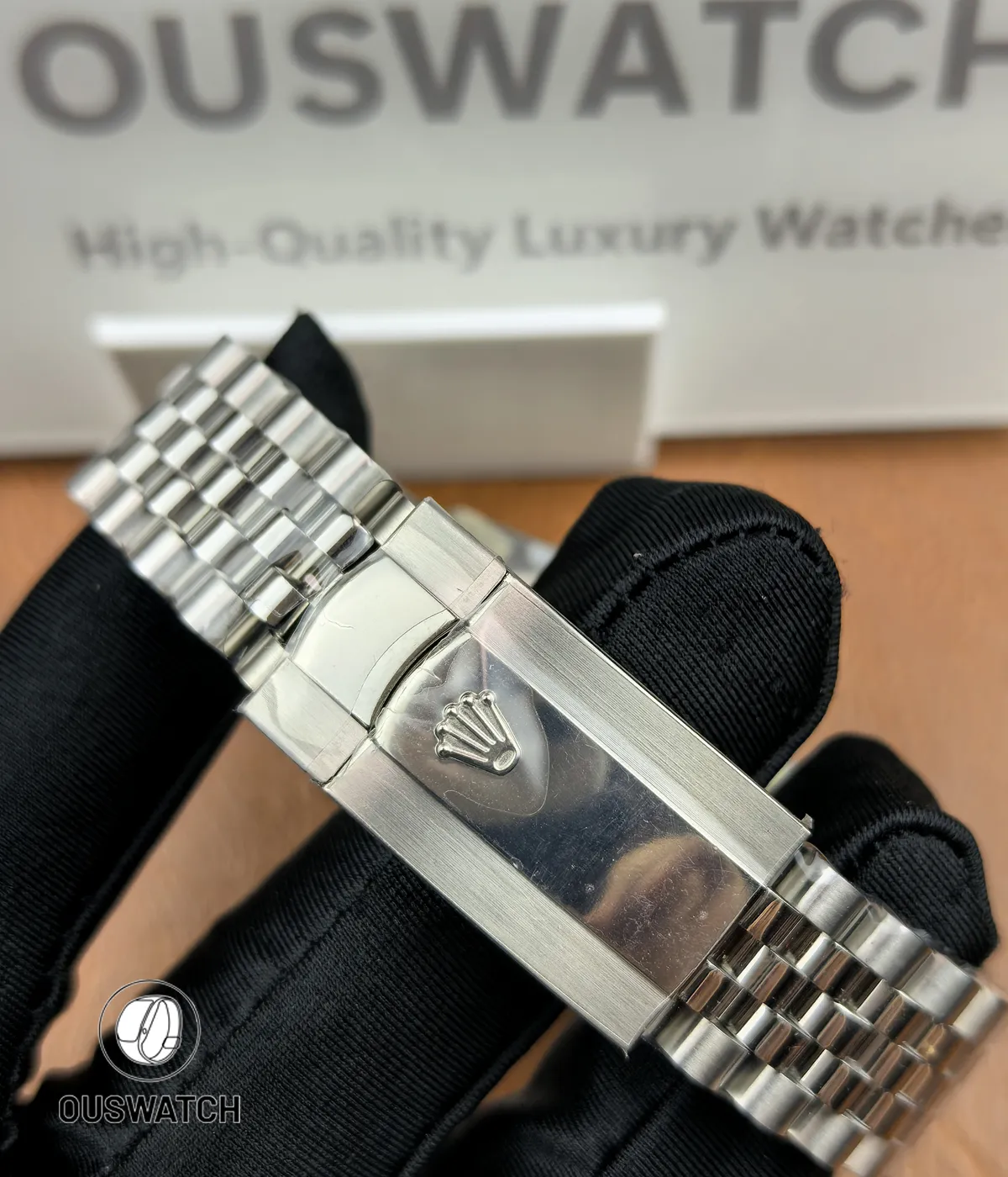 | Bracelet & Clasp | The iconic five-piece Jubilee bracelet is crafted from 904L steel. It is renowned for its exceptional comfort, flexibility, and distinctive polished center links. Fitted with a concealed Crownclasp that opens smoothly and closes securely, bearing the correct Rolex branding. |