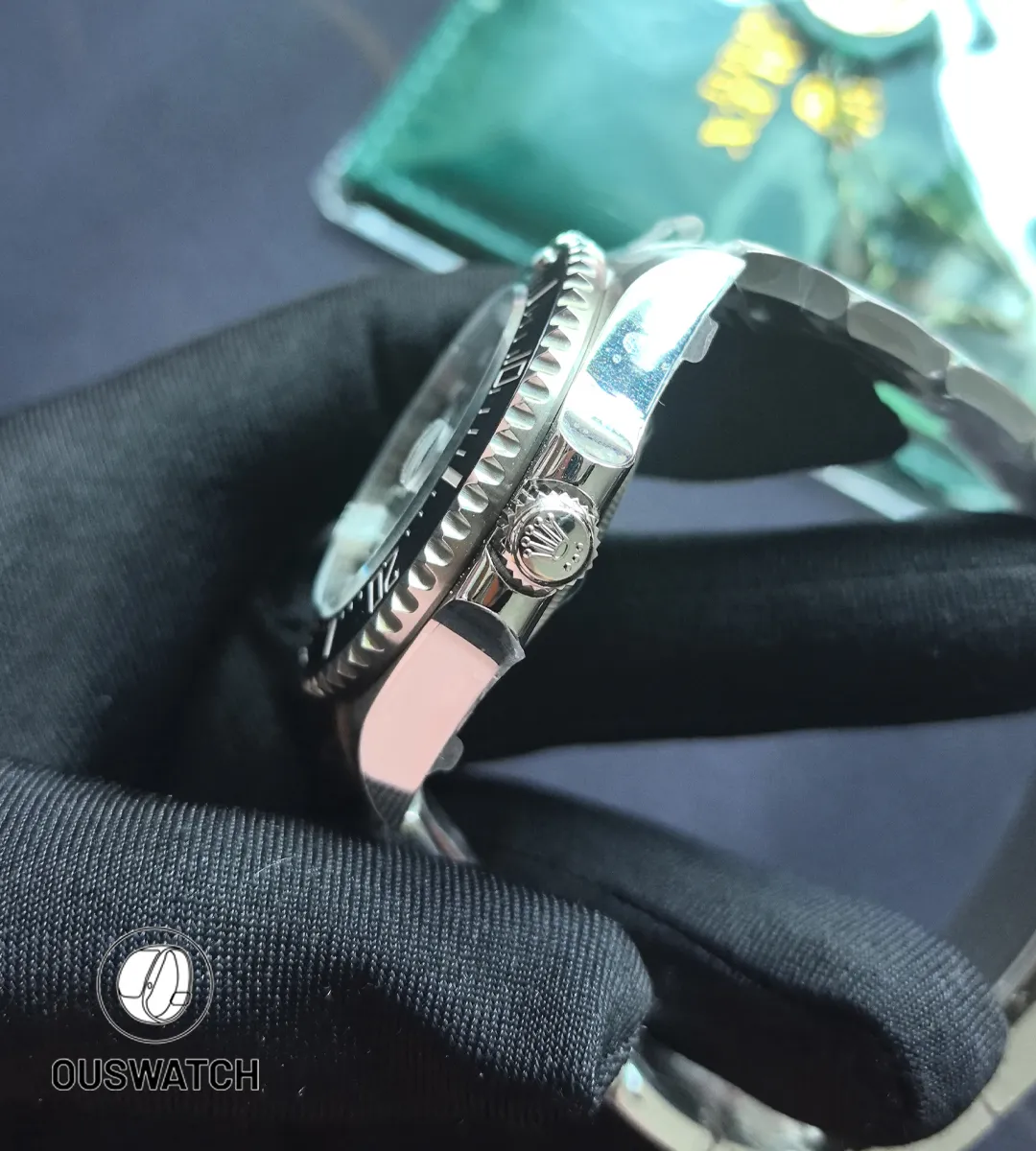 | Case | 43mm in diameter, machined from solid 904L Oystersteel—the same high-grade alloy used by Rolex for maximum corrosion resistance and a refined, lasting finish . The case weighs approximately 196 grams, closely matching the genuine article’s substantial feel . Features the signature helium escape valve at 9 o’clock, a fully functional detail rarely executed in lower-tier replicas . |
