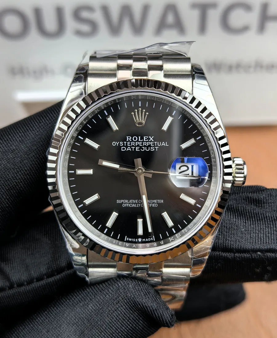 The Datejust is Rolex’s quintessential dress watch, and our clones capture its elegance in every detail. Take the Datejust 126234: it’s a 36mm Oystersteel timepiece with a fluted white-gold bezel, Jubilee bracelet, and date aperture. All of our Datejust clones share these defining traits (smooth automatic winding, quick-set date under a 2.5x Cyclops lens). Importantly, they include a clone of Rolex’s in-house Caliber 3235 movement, providing a 70hour power reserve and COSC-grade accuracy. Each dial (whether black, white, blue or another motif) is printed and applied exactly as on the original, with spotless indices and flawless logo spacing. The sapphire crystal, Cyclops magnifier and exact 100m water resistance standard are faithfully replicated, ensuring these Datejust Super Clones deliver the classic look and reliable performance collectors expect.