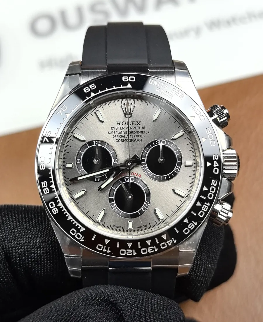 Our Daytona Super Clone collection includes Rolex’s famous racing chronographs. The flagship Daytona 126500LN (Panda) clone features the 40mm steel Oyster case with pushers and a black Cerachrom tachymeter bezel. As on the real watch, the white dial’s black subdials pop against the stainless finish. We install a high-grade clone of Rolex’s 4130/4131/4132 chronograph movement, so winding feels smooth and the stopwatch resets cleanly. The Cerachrom bezel (rated ~1200 on the Vickers hardness scale) maintains crisp red/black/white markings and resists wear under any conditions. In short, our Daytona clones look and operate just like the genuine article, from the engraved tachymeter scale to the polished steel case and sapphire crystal.