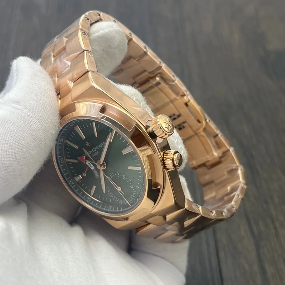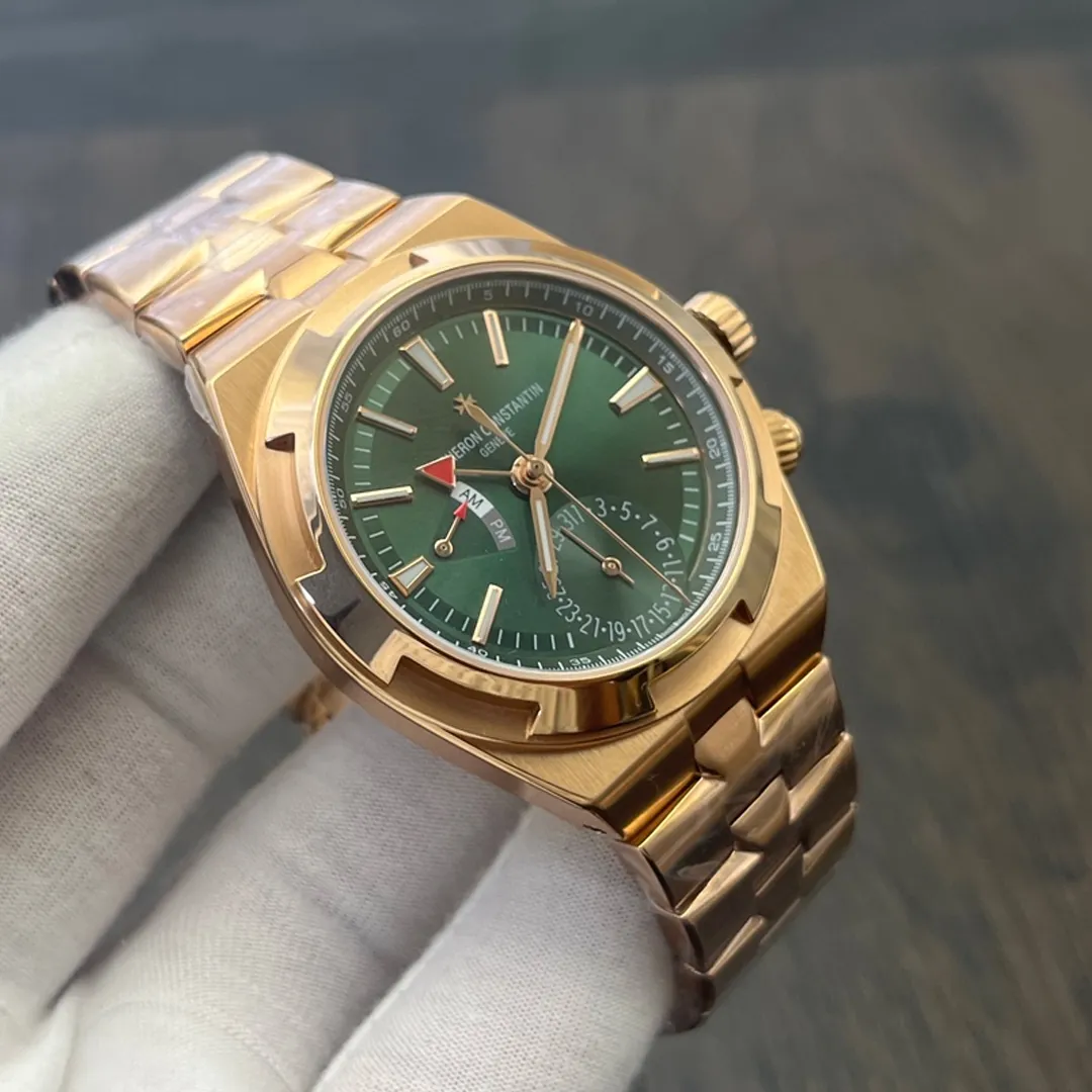 This Overseas replica is impressive. The green dial is unique and beautiful. The rose gold tone is spot on and the dual time function works smoothly. Highly recommend for a statement piece.