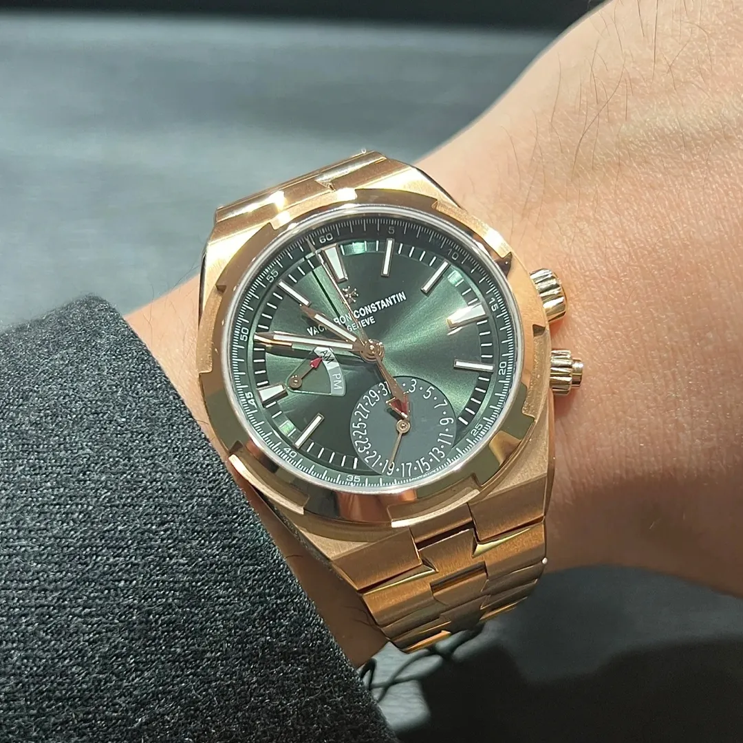 The Vacheron Overseas Dual Time green dial 7920V/210R-B965 is stunning. The pink rose gold case pairs perfectly with the green dial. The 41mm size is perfect. Very happy with this piece.